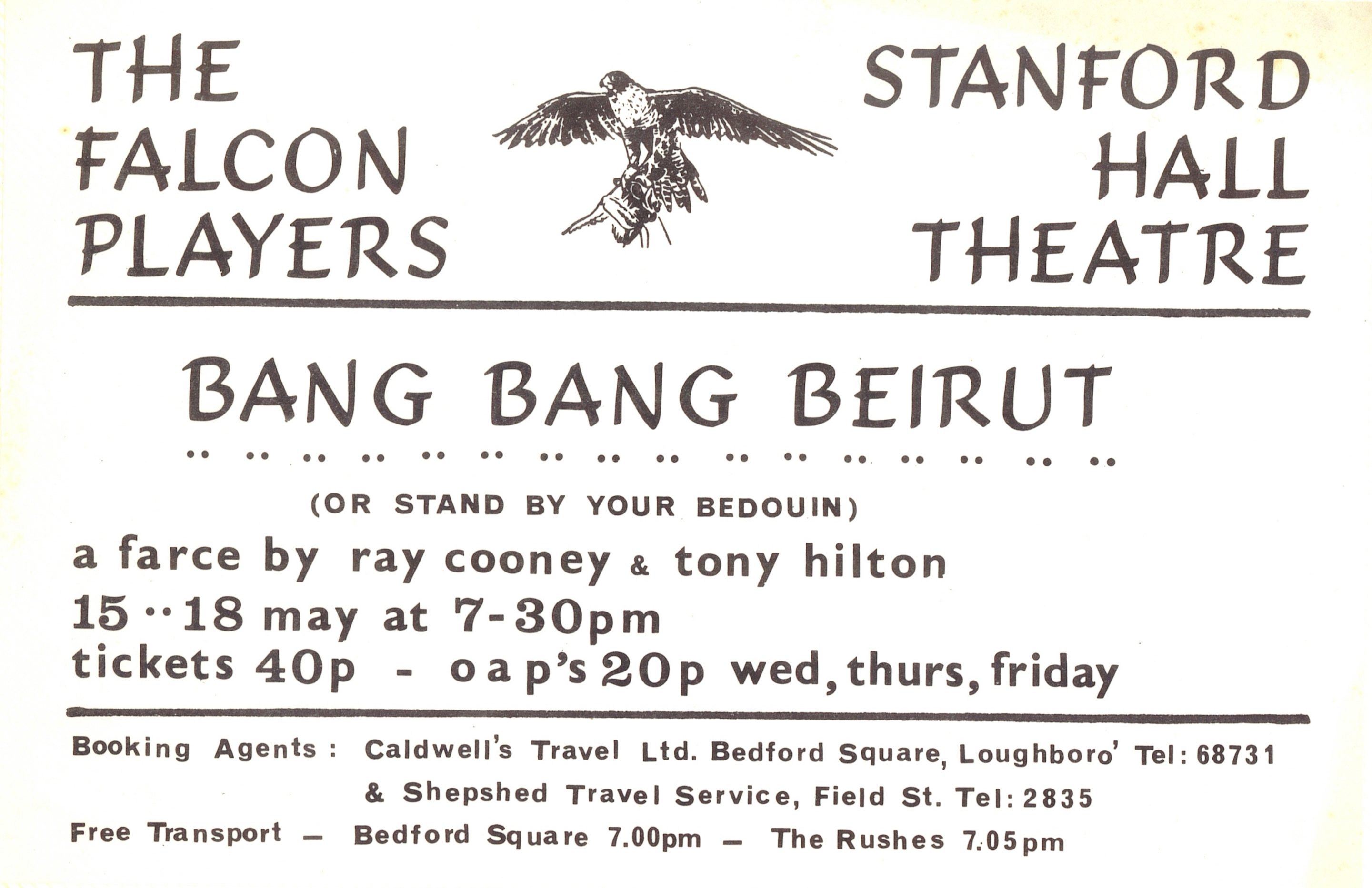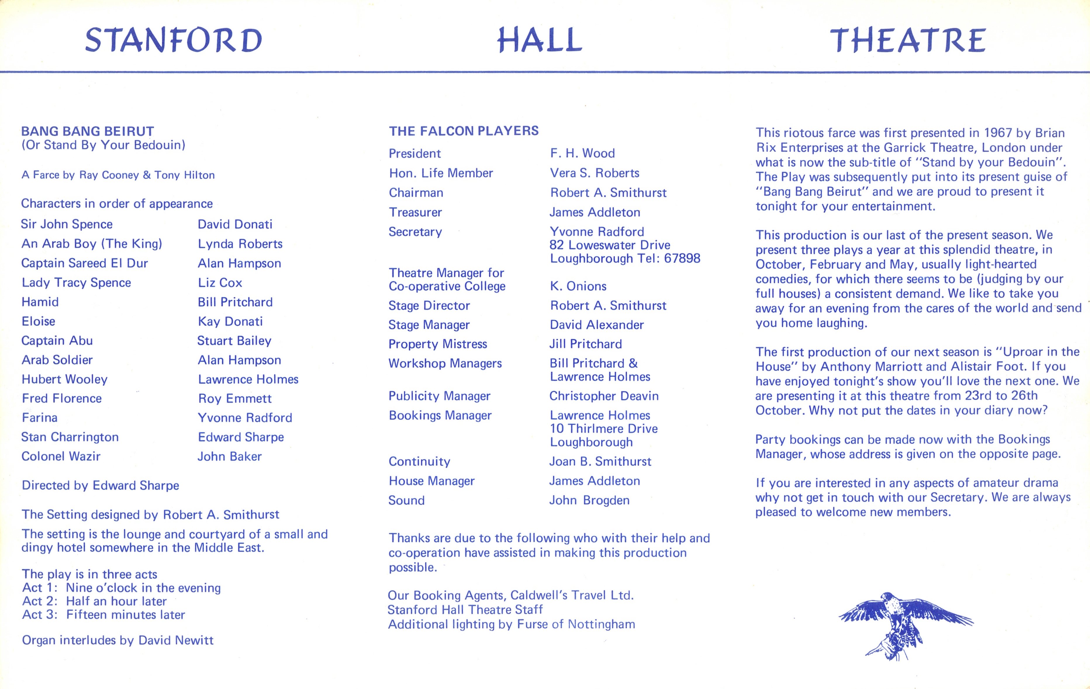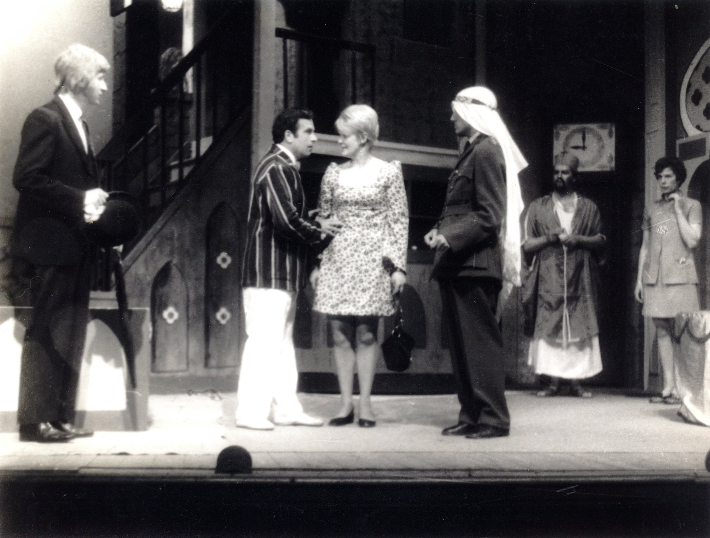An outrageously funny fame set in the lobby and courtyard of a small hotel in the Middle East, where a group of British undercover agents (in a variety of unlikely disguises) arc trying to weather a local military coup, while devising a plan to smuggle a young native prince out of danger. The bungling spies arouse the suspicions of the meal military and we are off on a mad whirl of double-takes, sliding panels, missing bodies and mistaken identities - the perfect ingredients for a fast-moving and hilarious evening's entertainment